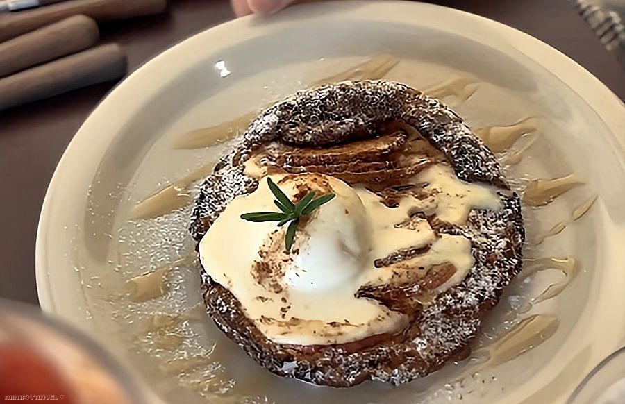 鬆餅外緣香脆,內裡鬆軟,加上蜜漬蘋果與肉桂香,口感溫潤又有層次,冷熱交融非常迷人。